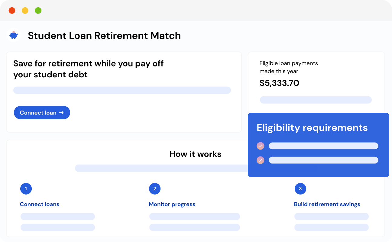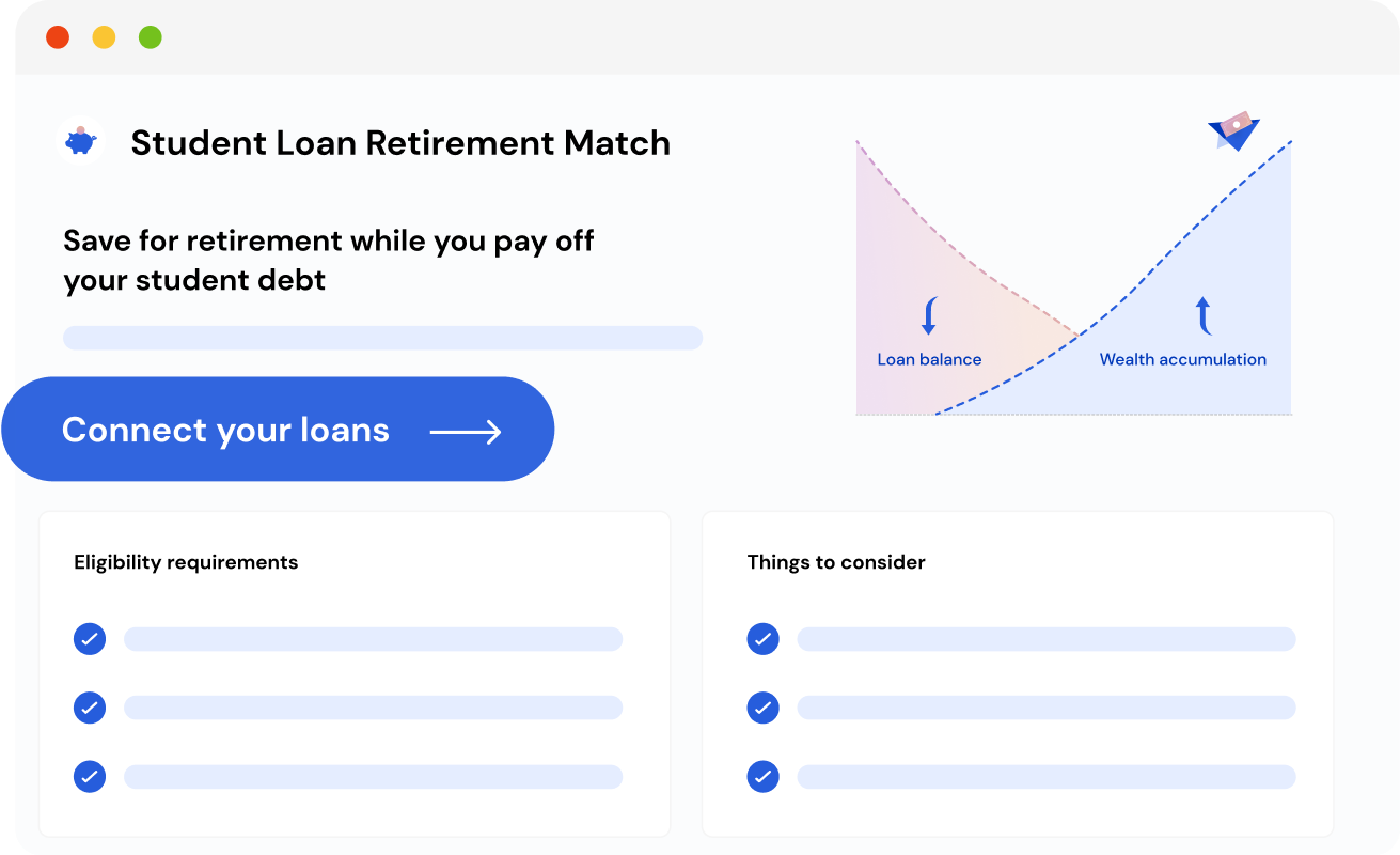 Watch nowMatch employees’ student loan payments with tax-advantaged retirement contributions assisted by our best-in-class, SECURE 2.0-friendly solution.